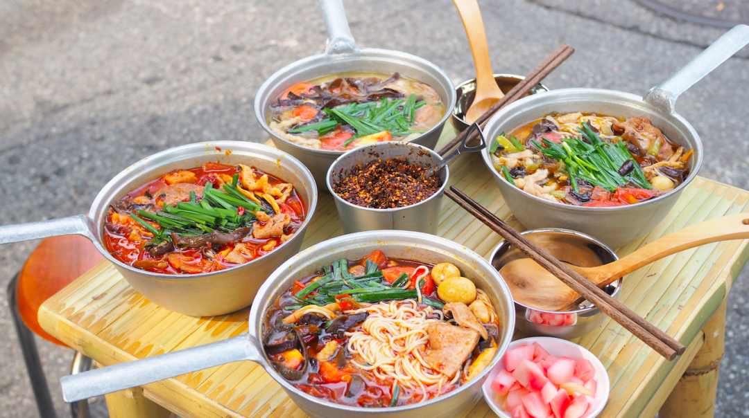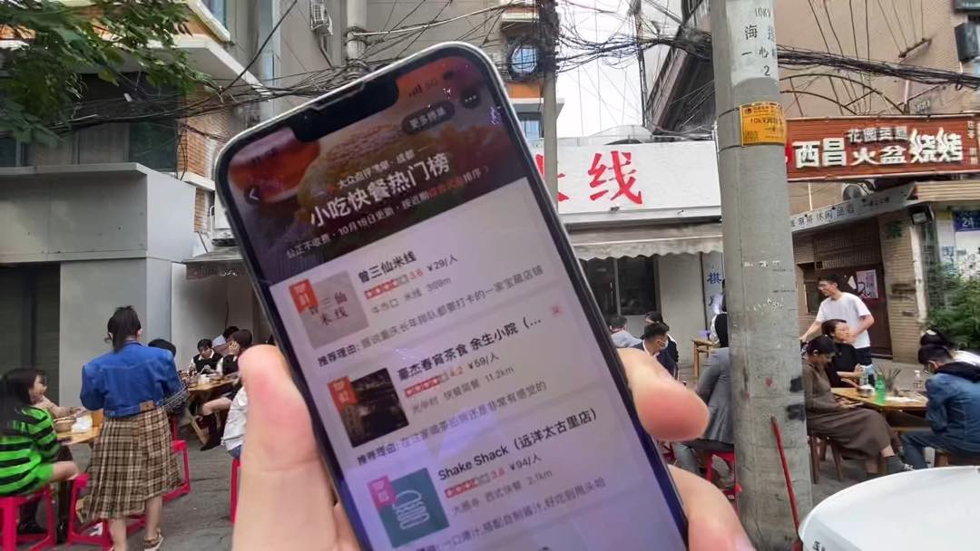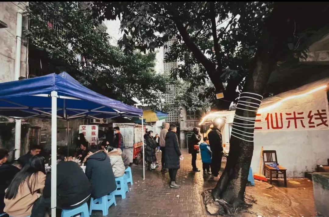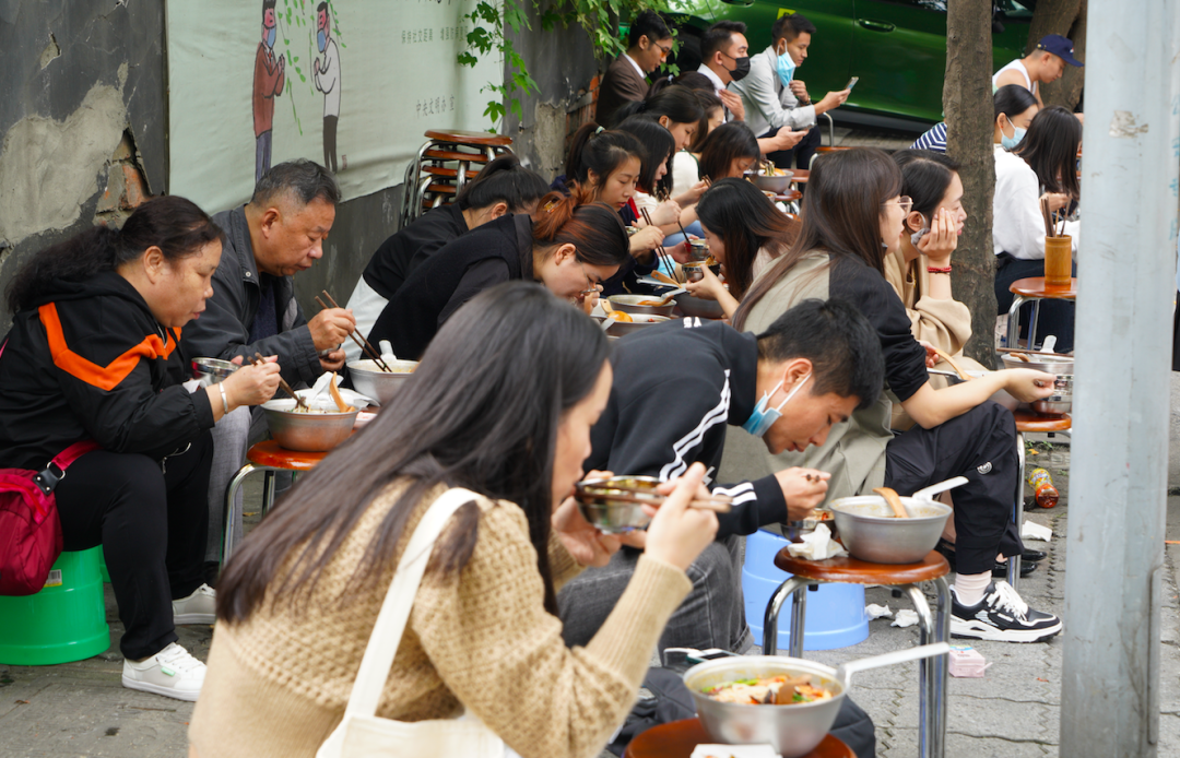 穿过高楼林立的闹市区,钻进成都的一条小巷子,老远就可以听见此起彼伏的叫号声,虽然是工作日,但这家米线店的门前早已坐满了等餐的顾客,来这儿的客人习惯性地自己安排位置,用板凳当桌子,形似“瓢”的器具当碗,坐在马路两旁,恣意地嗦着米线,顾客吃完一波又一波,生意异常火爆。