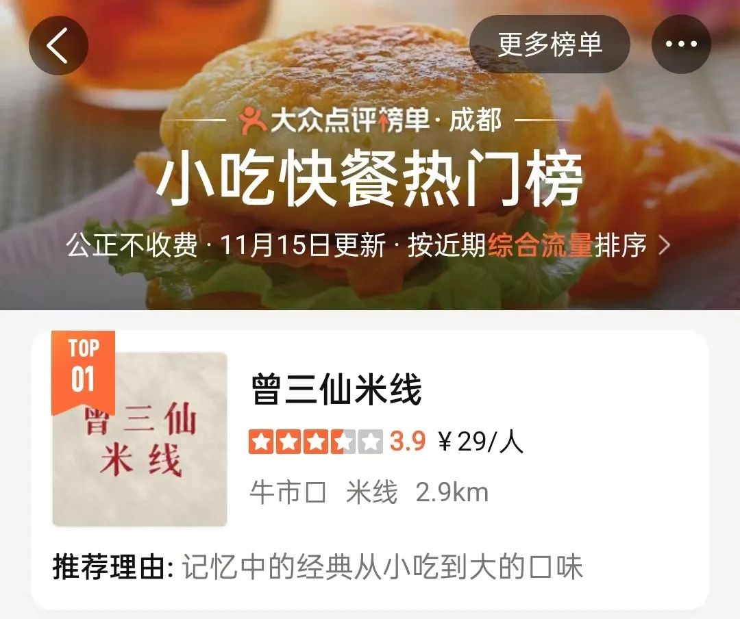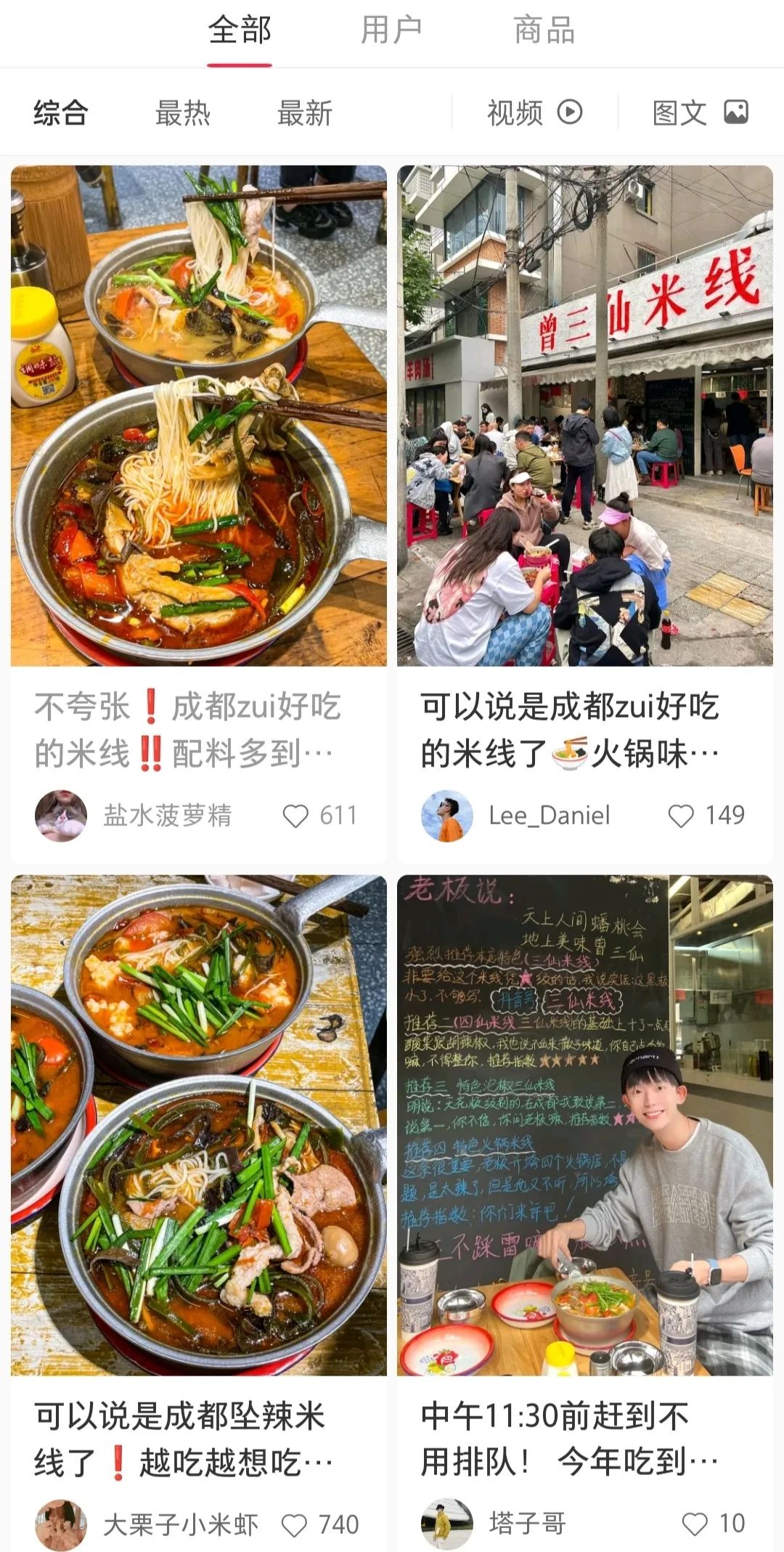 按照当代年轻人的寻味指南,我们发现,在抖音、小红书、大众点评等网络社交平台上,不乏有一系列关于曾三仙的探店攻略、消费者的视频和笔记等,以及“小吃快餐热门榜TOP1”的标签让人不得不思考一家米线店为什么能如此受食客追捧?这背后是营销手段的推动还是其他原因?