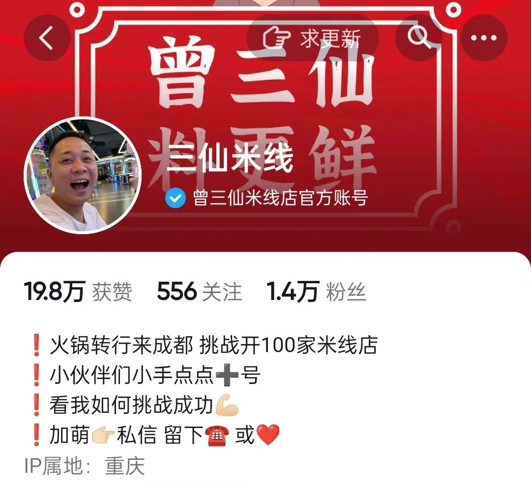 在抖音账号“三仙米线”中我们找到了一些答案,这里以创始人的视角记录了曾三仙从0到1,从选址筹建到开店经营的每一步,视频的主角便是“曾三仙米线”的创始人——赵永强,一个土生土长的重庆人,“火锅跨行来成都,挑战开100家米线店”是他的经典开场白,从中我们窥探出部分关于他个人的创业经历。