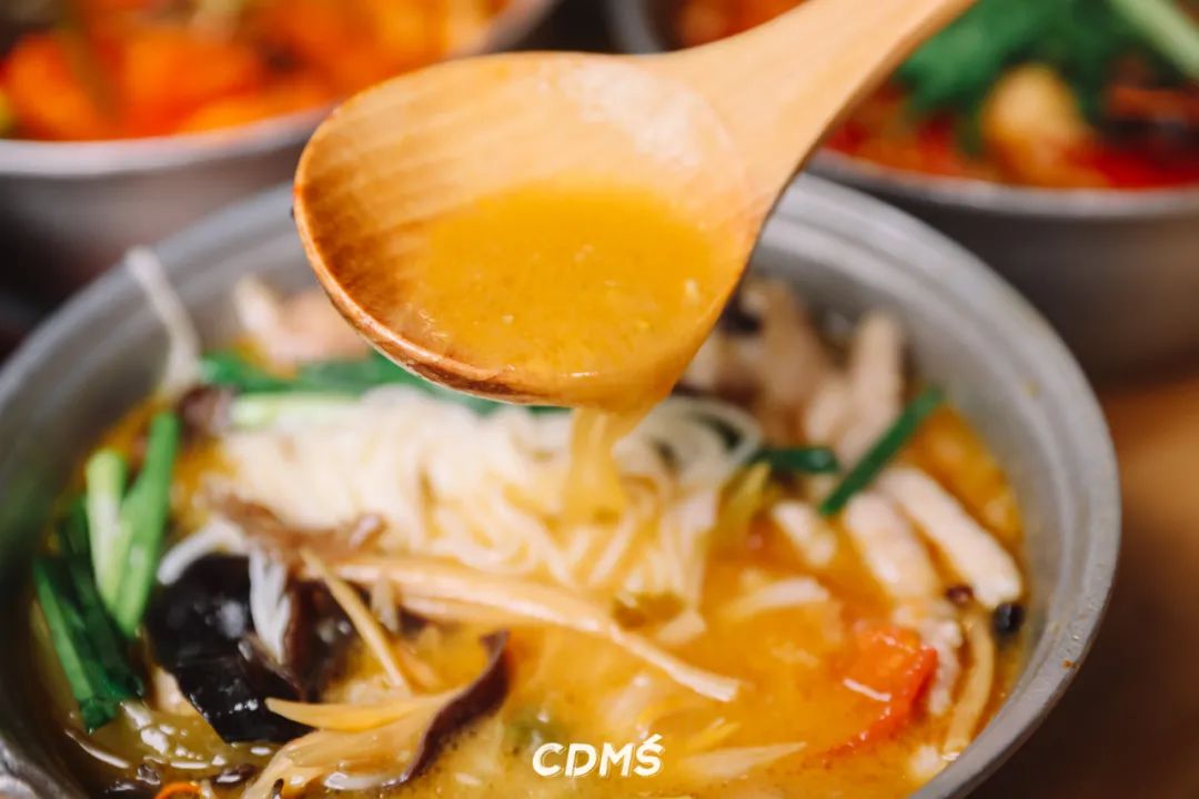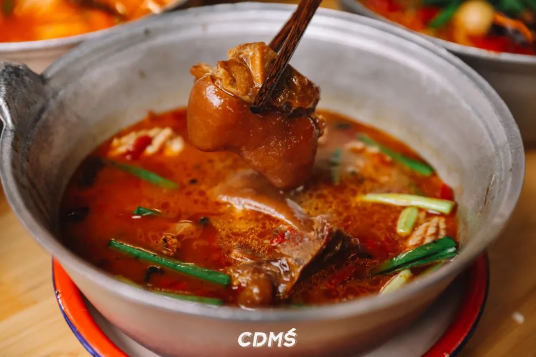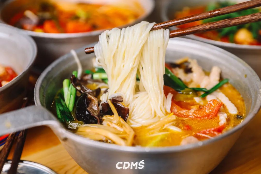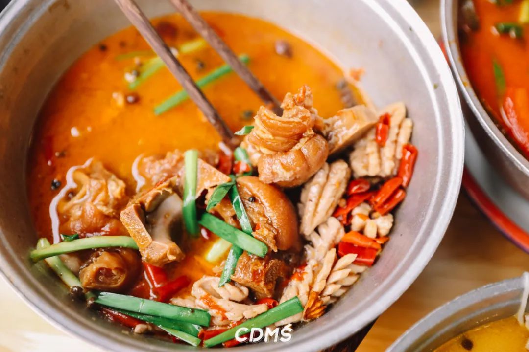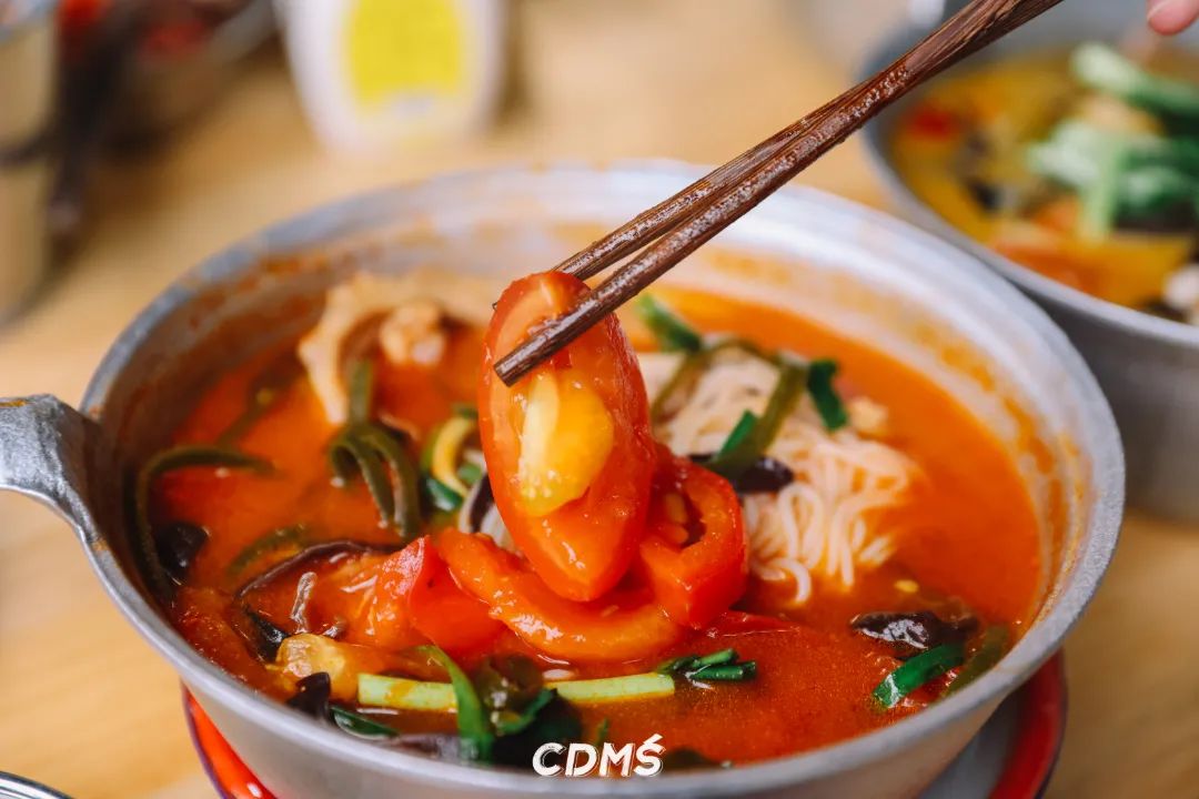 另外一款就是糯鸭掌米线,我们点的番茄味。这个味型就是和你在超市买的番茄汤锅包一样的味道。且我们在点单的时候,看到操作师傅,在锅里面加了三大勺鸡精,所以鲜味自然而然特别浓郁...