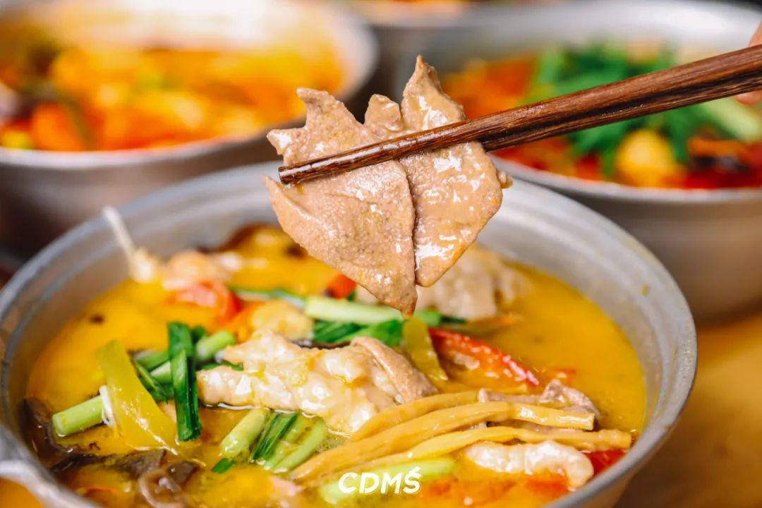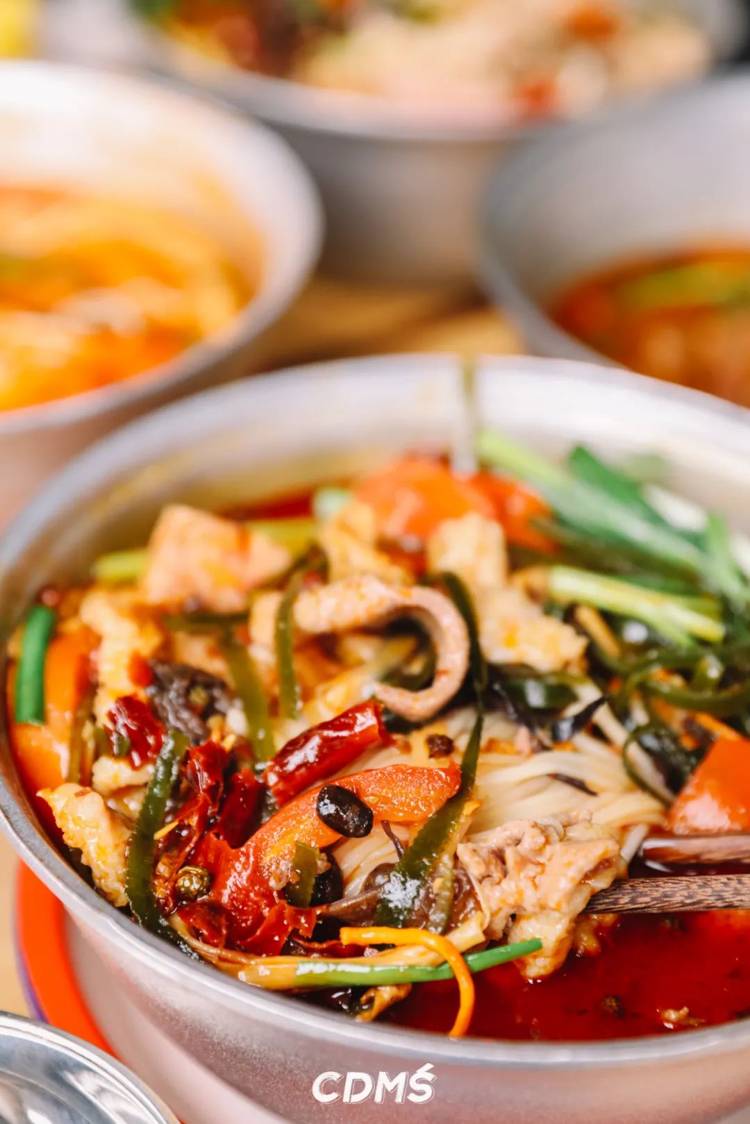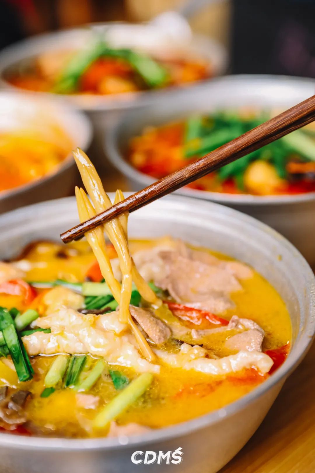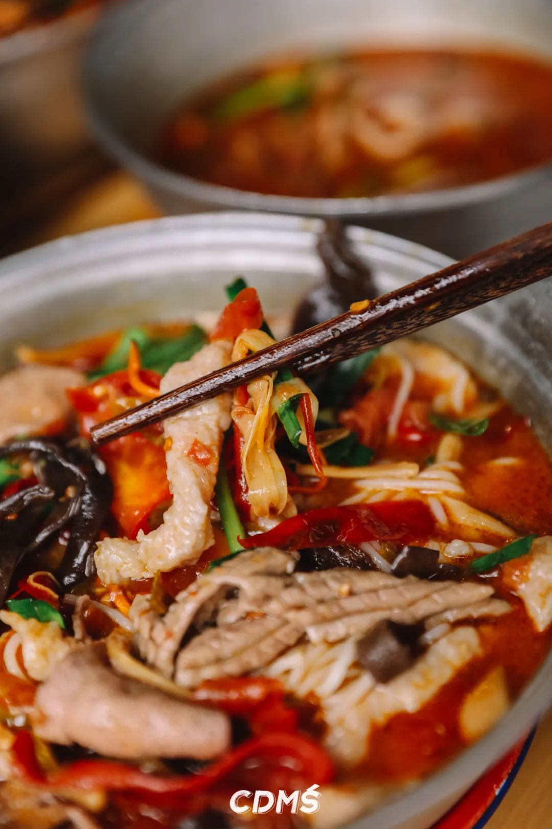 在我的印象中,重庆人除了小面,也真的是很爱嗦粉。而重庆的米线特色就是料多和味道重。传统的重庆米线,要加扎实和够味的浇头才过瘾。比如滑肉、猪肝、泡辣椒、酸萝卜、糊辣壳,辣味和香味在入口的时候直冲味蕾,那简直真的不摆了。 泡椒和火锅三仙